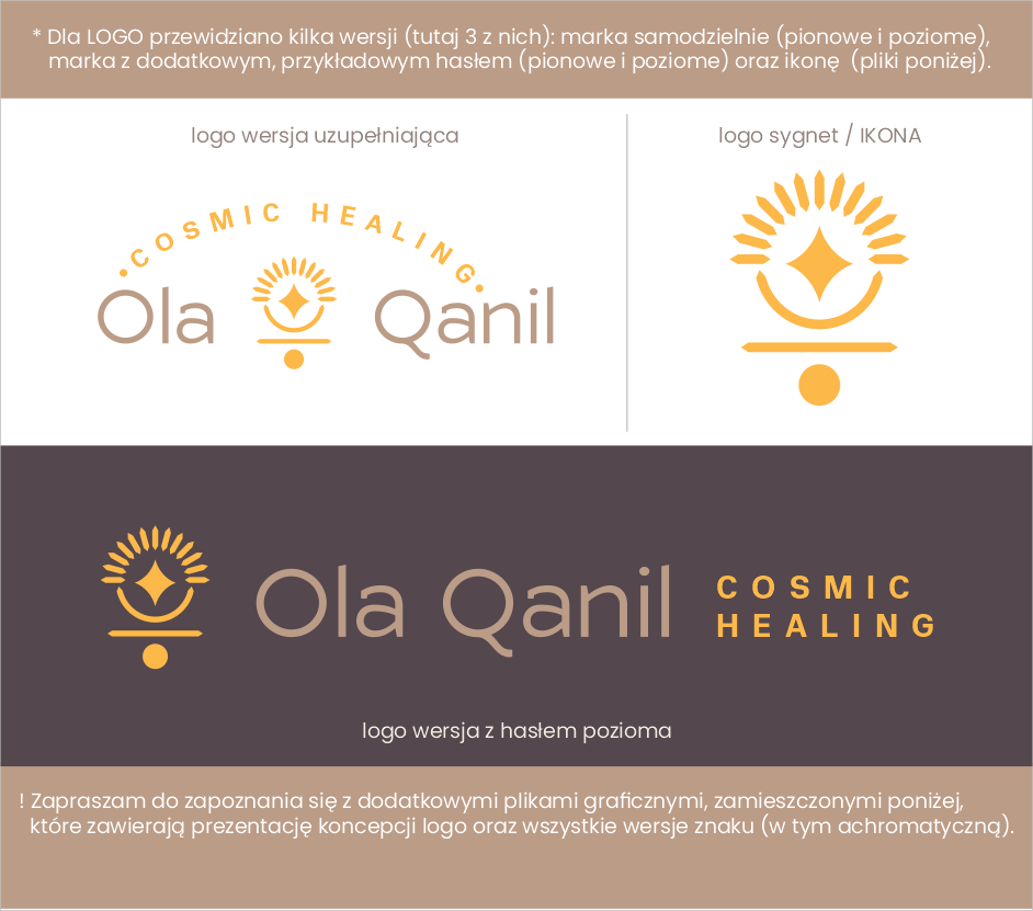 Zapraszam do zapoznania się z dodatkowymi plikami graficznymi, zamieszczonymi poniżej, które zawierają opis koncepcji logo oraz wszystkie wersje znaku.